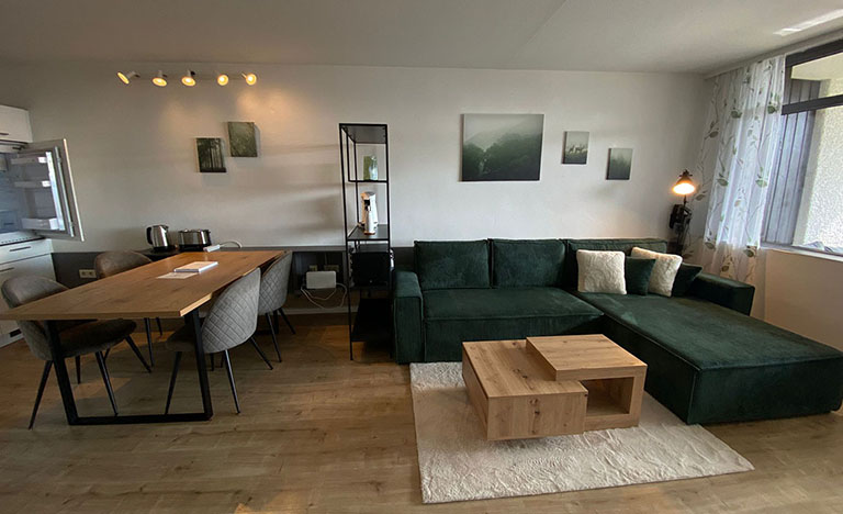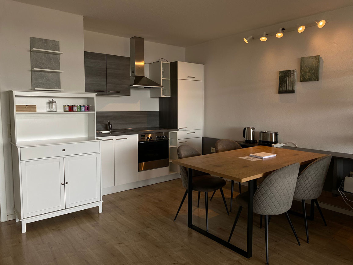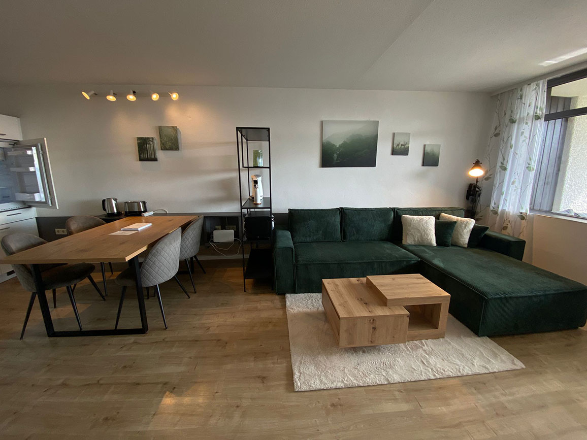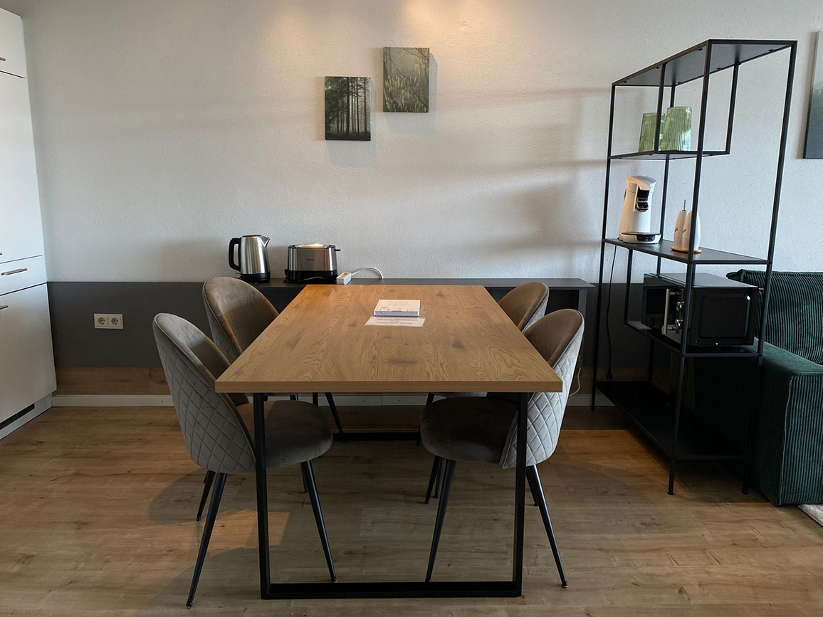 Das Apartment überzeugt mit einer modernen, geschmackvollen Einrichtung, klaren Linien und hochwertigen Materialien. Der offene Wohn- und Essbereich lädt zum Verweilen ein, die gemütliche Atmosphäre sort dafür, dass Sie sich vom ersten Moment an wie zuhause fühlen. Eine voll ausgestattete Küche bietet alles, was Sie für entspannte Kochabende benötigen, während das komfortable Schlafzimmer mit Fenster Richtung Wald erholsame Nächte garantiert.