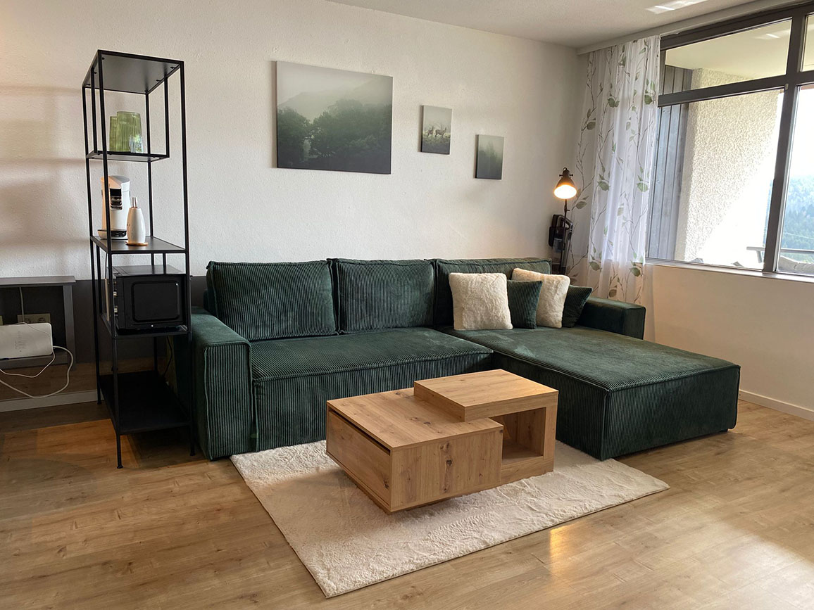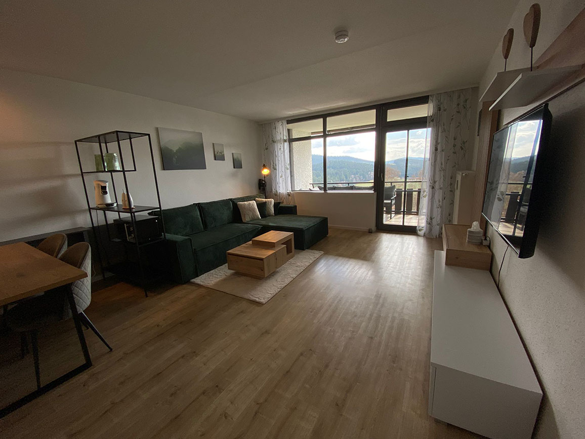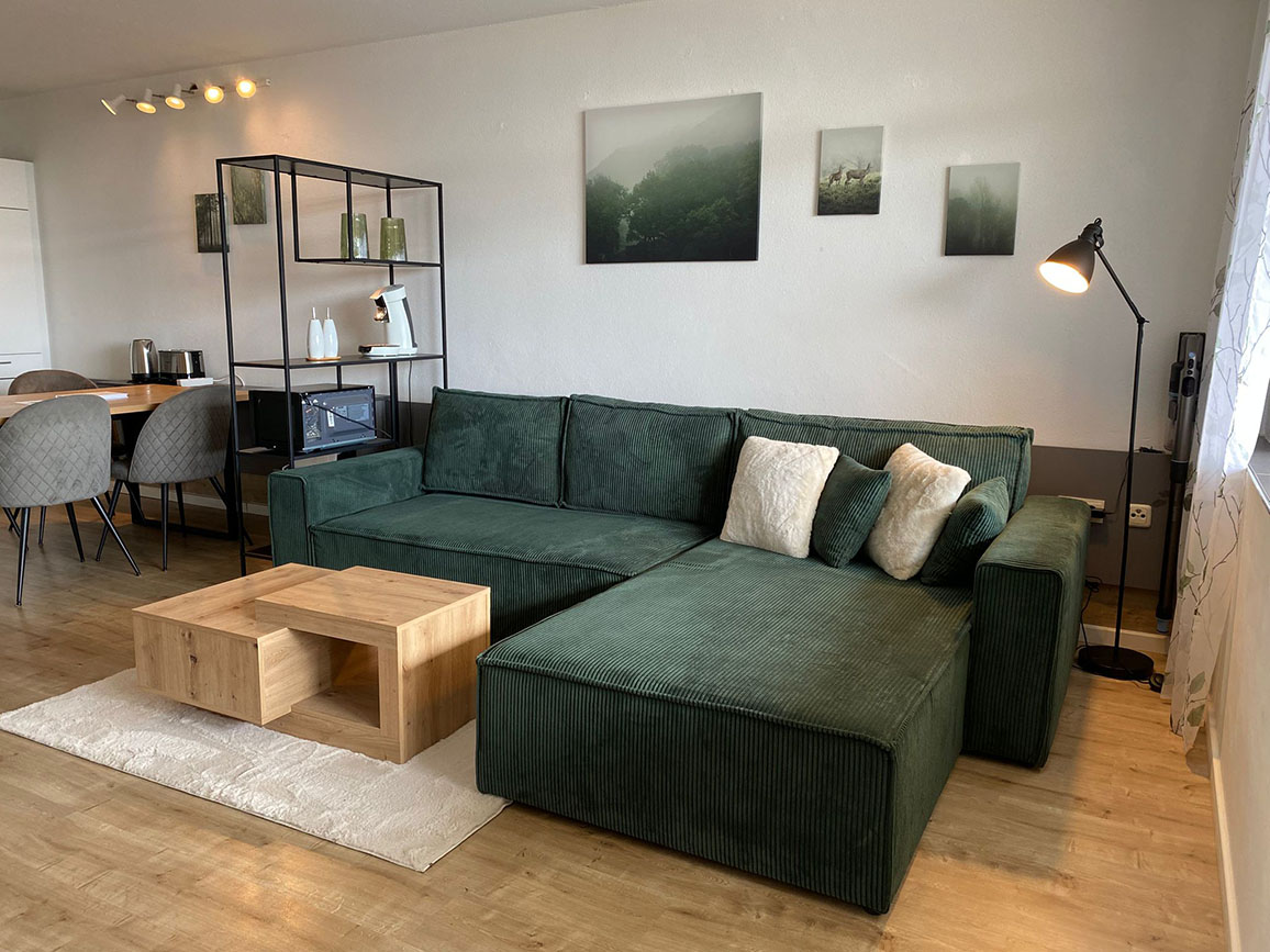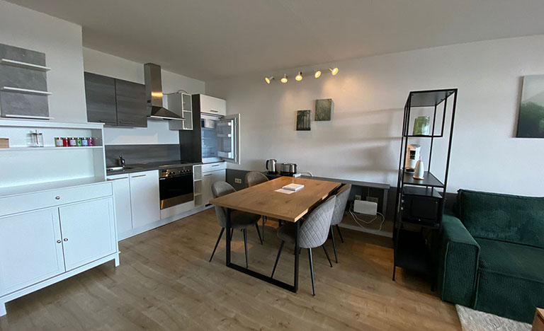 Das Apartment überzeugt mit einer modernen, geschmackvollen Einrichtung, klaren Linien und hochwertigen Materialien. Der offene Wohn- und Essbereich lädt zum Verweilen ein, die gemütliche Atmosphäre sort dafür, dass Sie sich vom ersten Moment an wie zuhause fühlen. Eine voll ausgestattete Küche bietet alles, was Sie für entspannte Kochabende benötigen, während das komfortable Schlafzimmer mit Fenster Richtung Wald erholsame Nächte garantiert.