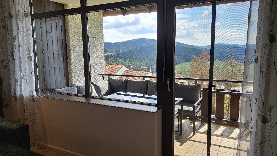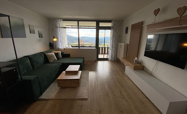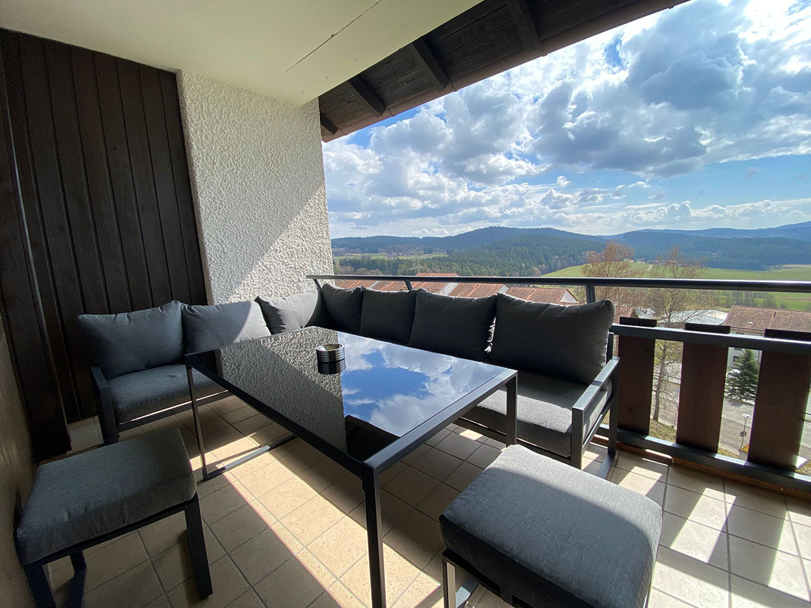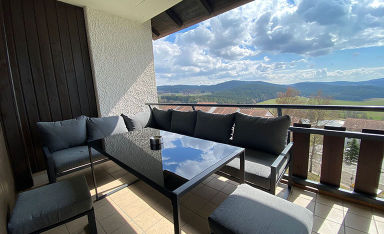 Große Fensterfronten holen die Natur direkt ins Apartment und schenken Ihnen zu jeder Tageszeit ein beeindruckendes Panorama. Ob beim Frühstück mit Blick ins Grüne oder bei einem Glas Wein zum Sonnenuntergang – die Aussicht wird zu Ihrem Highlight. Wohlfühlen auf dem großen Balkon mit Lounge und Grill.